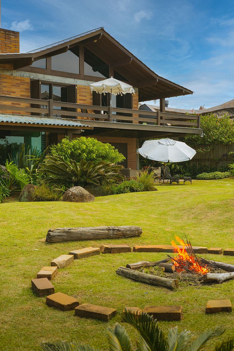 O acesso a Casa se dá pelo portao da frente, com o carro voce chega ate a area coberta de frente para a porta de entrada para a casa no segundo pavimento. O jardim a frente é amplo e muito agradavel, ele pode ser compartilhado se houverem mais hospedes, ali tambem ha espacao para fazer fogueira e a praia ja esta logo a frente.